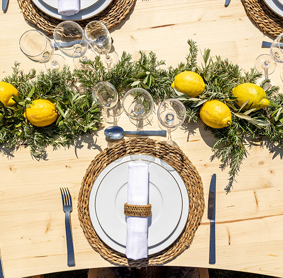 Le secret : jouer avec les contrastes naturels. Bois clair, verdure méditerranéenne, citron en touche centrale, fibres tressées et quelques bougies suffisent pour créer une ambiance fraîche et solaire.