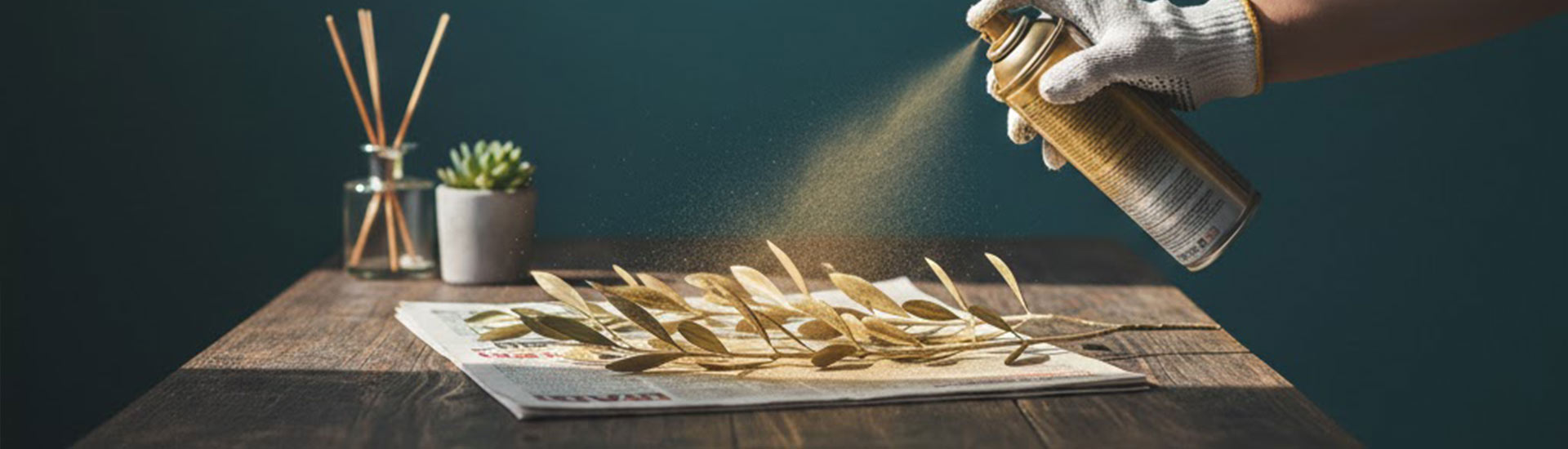 Sur une surface protégée, bombez la peinture avec des gestes courts à 25–30 cm en fine couche. Laissez sécher les feuilles, retournez-les et recommencez. La dorure est plus belle en deux couches qu’en une seule grosse couche.