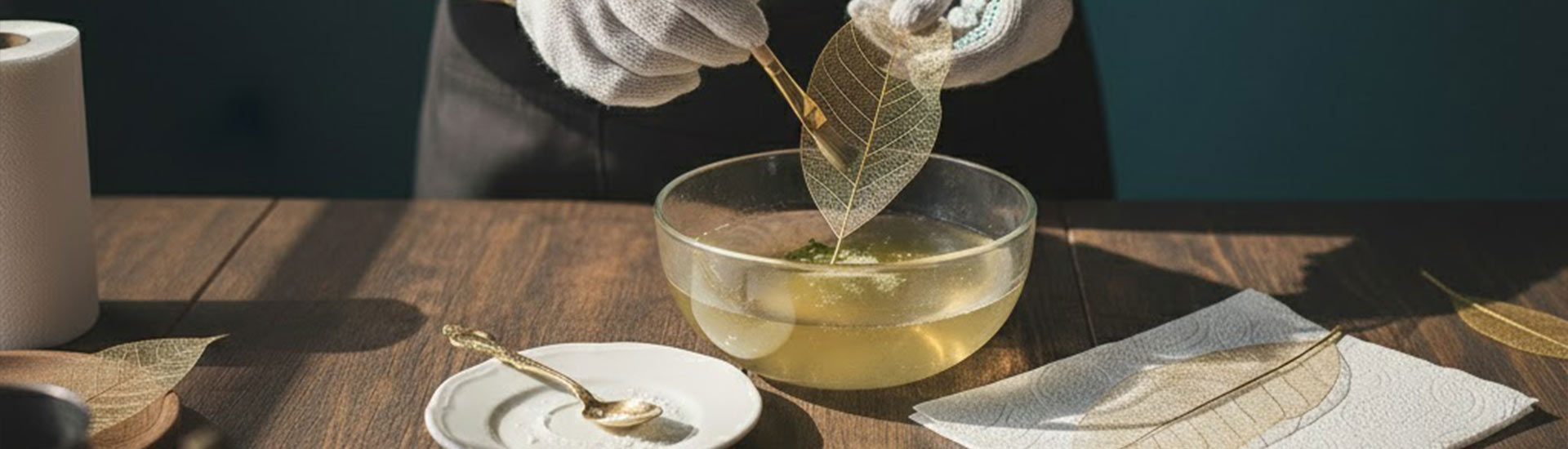 Choisissez des feuilles d’arbres aux nervures marquées (magnolia, hortensia, érable). Faites-les tremper dans de l’eau tiède avec une cuillère de carbonate de sodium (ou lessive de soude douce) 1–2 heures, puis frottez délicatement la pulpe au pinceau souple pour ne garder que le réseau de nervures. Rincez, laissez sécher bien à plat dans du papier absorbant, puis appliquez une dorure en spray en fines couches. Résultat : un squelette ultra-léger, graphique, parfait en marque-place ou sous cloche décorative.
