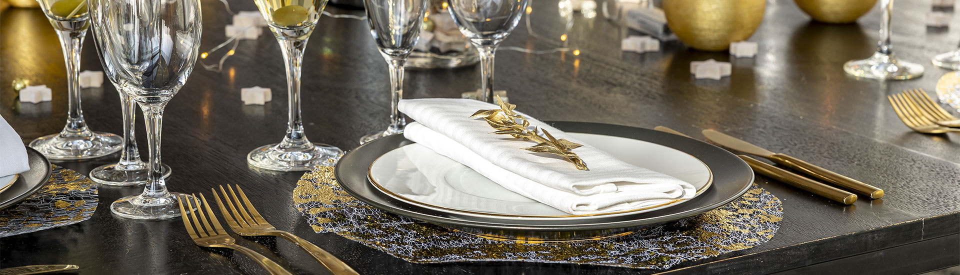 Alignez vos feuilles d’arbres dorées au centre, en quinconce, sur une nappe unie (lin ou coton). Glissez 2–3 photophores bas entre les feuilles pour capter la lumière sans surcharger. Option rapide : alternez dorure or/cuivre pour un rendu “mix & match”.