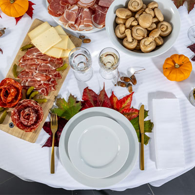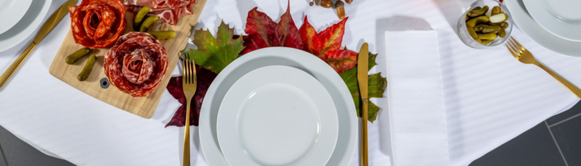 Place une nappe blanche, un chemin de table en tissu naturel ou une simple table en bois clair. On reste sur une ambiance douce, automnale et réconfortante.