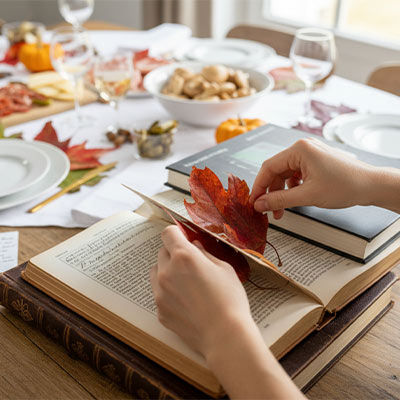 Pars en balade, récupère des feuilles d’automne aux couleurs variées : jaune, rouge, brun, ou même vert foncé. Privilégie les feuilles d’automne plates et un peu larges, plus faciles à placer sous les assiettes.
