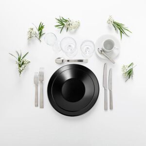 Nous vous proposons à la location ce pack d'assiettes noires au style moderne et tendance, avec les indispensables pour votre déjeuner ou votre dîner.